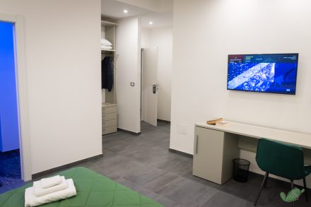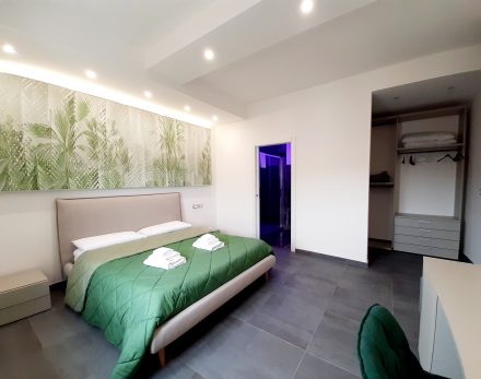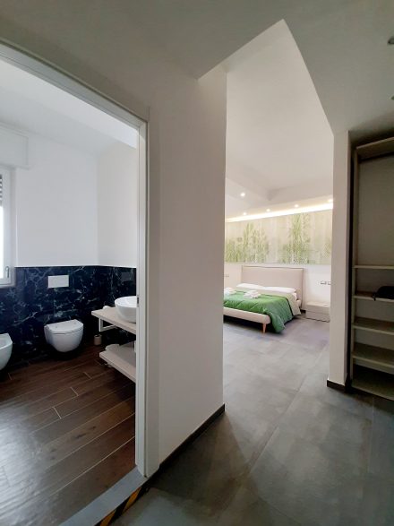 Ampia camera matrimoniale con cabina armadio a vista e vano doccia con cromoterapia separato dal bagno